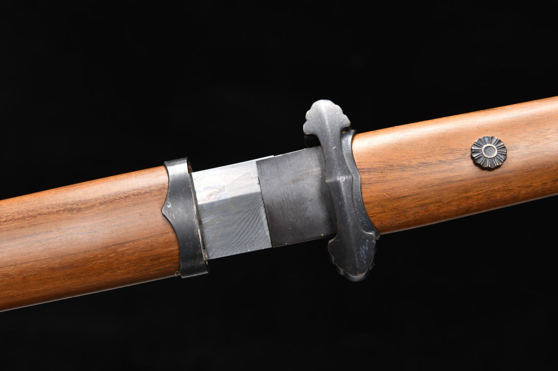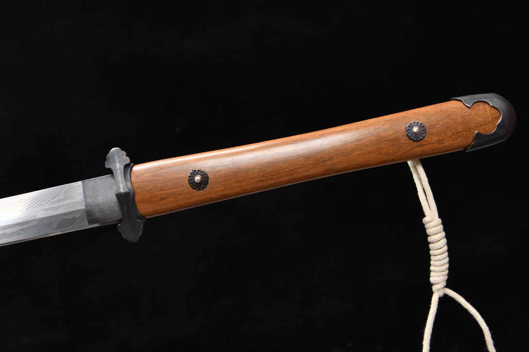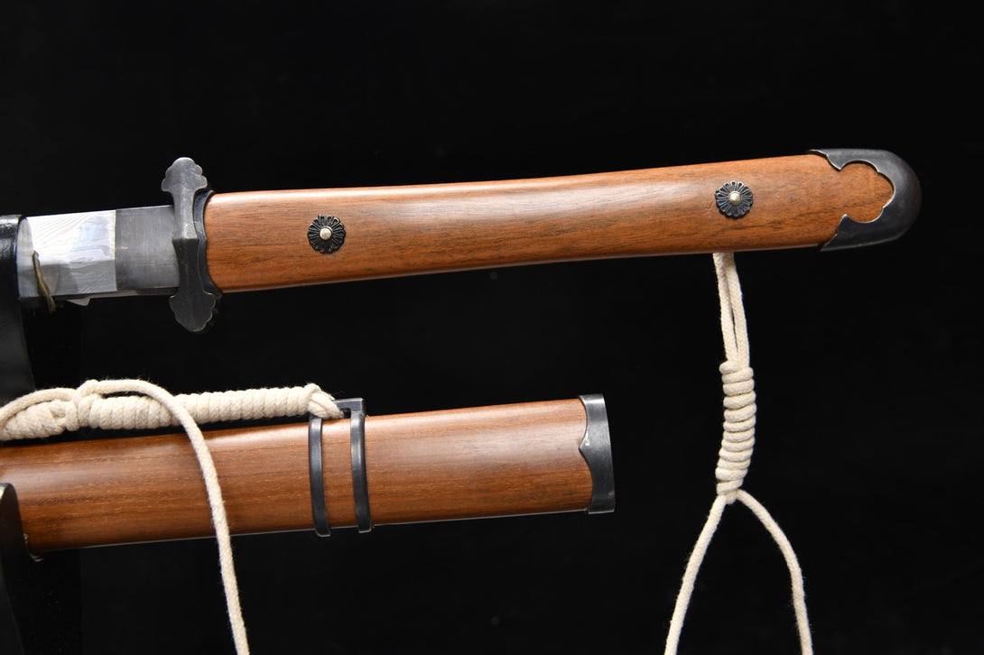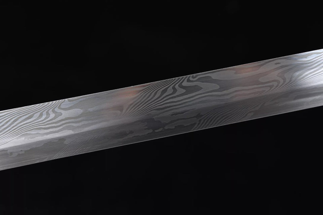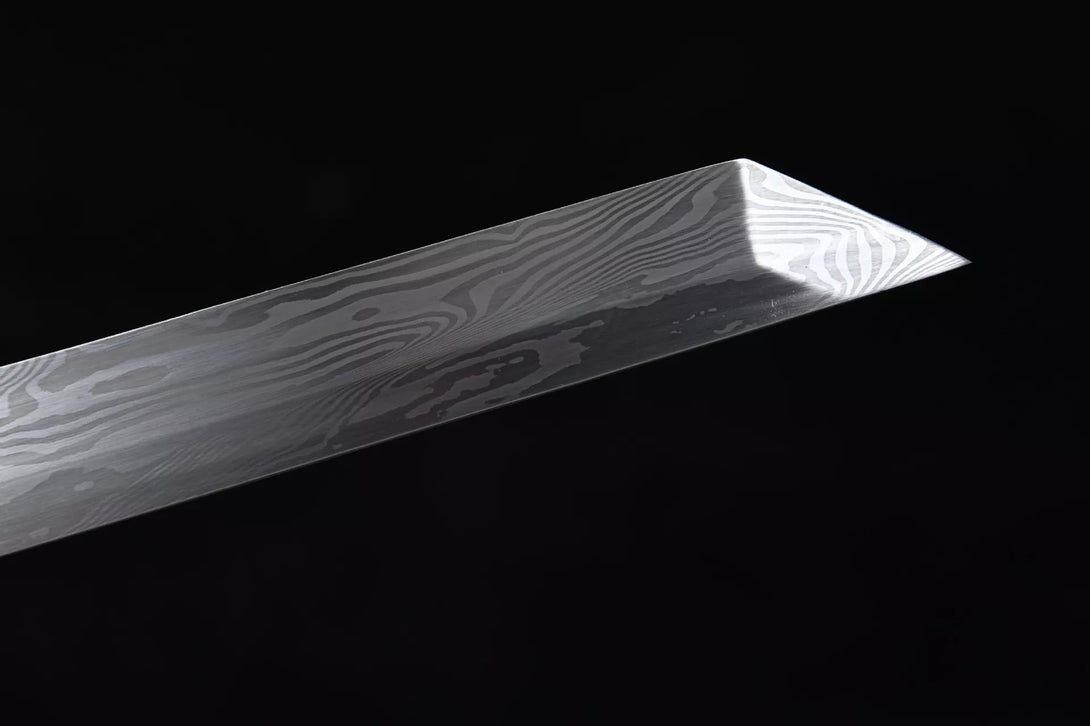 Steel: Damascus pattern steel hand-forged, high temperature quenching, 15 hand-grinded, 90 degrees bending without deformation